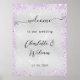 Ein silberfarbenes Imitat mit violettem, lavendelfarbenem Imitat, Glitzer Glitzern und 3 Schmetterlinge wie Wasserzeichen. Mit dem Text: Willkommen zu unserer Hochzeit. Personalisieren Sie Ihre Namen und fügen Sie sie hinzu.