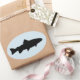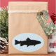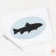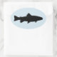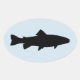 Ovaler Aufkleber mit einfacher zweifarbiger Forelle-Silhouette.