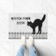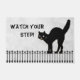 Dies ist eine Halloween-Illustration mit einer Silhouette einer schwarzen Katze auf einem Zaun mit grauem/weißem Grunge-Hintergrund und einem Gruß, "Pass auf deinen Schritt auf". Dekorieren Sie Ihre Zuhause oder Ihr Büro in diesem Halloween-Urlaub mit einer persönlichen Begrüßungsmatte.