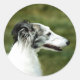 Silken Windhound Foto mit grün/braun verschwommenem Hintergrund.