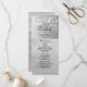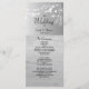 Elegantes, modernes, rustikales, schwarz-weißes Hochzeitsprogramm mit Vintag silberner Blütenspitze und Lichtern aus Streichholz.