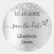 Ein Save the Date Aufkleber für Ihre Hochzeit. Ein Imitat silber aussehender Hintergrund, schwarzer Text. Dekoriert mit Konfetti und einem kleinen Herz. Personalisieren und fügen Sie Ihre Namen und Hochzeitsdatum.