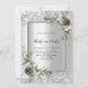 Imitate silber aussehender Hintergrund mit Kiefernkonen, weiße Beeren, grüne Blätter, Imitate silberner Glitzer, Glitzern. Personalisieren Sie Ihre Party-Daten und fügen Sie sie hinzu. Schwarze Buchstaben.