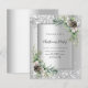 Imitate silber aussehender Hintergrund mit Kiefernkonen, weiße Beeren, grüne Blätter, Imitate silberner Glitzer, Glitzern. Personalisieren Sie Ihre Party-Daten und fügen Sie sie hinzu. Schwarze Buchstaben. 1 Blatt = 1 Einladung mit Druckkante bis Kante.