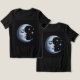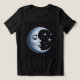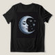 Dieser T - Shirt zeigt eine digitale Kunstdarstellung eines Halbmonds mit einem menschlichen Gesicht auf schwarzem Hintergrund. Das Design entstand mit generativer Kunst. Das Mondbild ist eine silberne Metallic-Farbe. Die Oberfläche des Mondes hat eine metallische, silberne Textur mit subtilen Schatten und Lichtern. Das Gesicht des Mondes ist mit geschlossenen Augen mit langen schwarzen Wimpern, einer gekrümmten Augenbraue und glänzenden lila Lippen versehen. Auf der rechten Seite des Mondes befinden sich leuchtende Sterne aus Silber mit einem strahlenden Effekt. Das Bild befindet sich auf der Vorder- und Rückseite des T - Shirt.