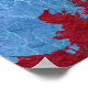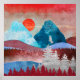 Ein wunderschönes abstraktes Landschaftsdesign mit Berg- und Waldszene und ein Adler, der auf einem Baum in lebhaften Blau-, Zyan-, Silber- und Crimsontönen landet.