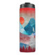 Ein wunderschönes abstraktes Landschaftsdesign mit Berg- und Waldszene und ein Adler, der auf einem Baum in lebhaften Blau-, Zyan-, Silber- und Crimsontönen landet.