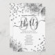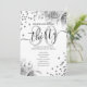 Elegante Glam Silver Floral Glitzer 30. Geburtstag Script Vorlage mit Party-Programm und Menü-Text, Blume Arrangements, Glitzer Konfetti und moderne Typografie Skript.