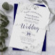 Diese schöne Hochzeitseinladung zeichnet sich durch ein schlichtes und dennoch elegantes Design aus, mit marineblau blauen Text- und laky-Script-Kalligraphie auf grauem Hintergrund und fein silbergrauem Imitat-Filigree in den Ecken. Die Formulierung ist formell, aber die Gestaltung ist modern und stilvoll.