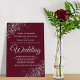 Diese schlichte und elegante Hochzeitseinladung besticht durch eine graue Schriftzeichen auf weinrotem oder bordeauxrotem Hintergrund. Das Design ist schlicht, aber die Ecken sind mit einer verzierten silbernen Imitat-Folie florale Filigree mit Gürteln und Falten versehen. Der Text ist formell und traditionell, aber das schicke Design macht diese Einladung für jede Hochzeit geeignet.