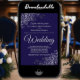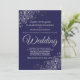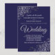 Diese schlichte und elegante Hochzeitseinladung mit grauem Schriftzeichen auf marineblau-blauem Hintergrund. Das Design ist schlicht, aber die Ecken sind mit einer verzierten silbernen Imitat-Folie florale Filigree mit Gürteln und Falten versehen. Der Text ist formell und traditionell, aber das schicke Design macht diese Einladung für jede Hochzeit geeignet.