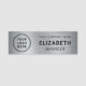 Modernes Namensschild mit Ihrem Firmenlogo vor einem silbernen Imitat mit metallischem Hintergrund. Fügen Sie in einfacher Typografie Ihren Firmennamen und den Namen und Titel des Mitarbeiters hinzu.