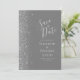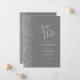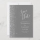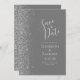 Die links Hand dieses eleganten, modernen Hochzeitsgeschehens bewahrt die Dattelkarte mit einem silbernen Imitat Glitzer Rand. Der anpassbare Text kombiniert silbergraue Handschrift, Kupferplatte und kursiv Schriftart auf grauem Hintergrund. Auf der Rückseite ist ein passendes grau- und silberfarbenes Design erkennbar.