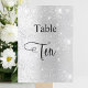 Die Tischnummer ist mit einem handgeschriebenen, eleganten Schriftsatz geschrieben. Schwarze Buchstaben, ein Imitat silber Hintergrund mit Imitaten Glitzer Staub, Glitzern.