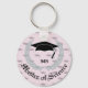 Master of Science Degree Abschluss Silver Laurel Wreath Schlüsselanhänger. Feiern Sie Ihren M.S.-Abschluss mit diesem coolen Design. Ein silberner Lorbeerkranz umringt ein schwarz stilisiertes akademisches Mörserboard mit den Buchstaben "MS" darunter. Der Abschluss "Master of Science" ist in extravaganter Kalligrafie unter dem Silberkranz geschrieben. Das Design wird auf einem grauen, mehrfarbigen Motherboard-Hintergrundmuster platziert. Sie können die hellrosa Hintergrundfarbe in die Farbe ändern, die Sie bevorzugen. Separate Designs für andere Meister, Bachelor und höhere Grade verfügbar.