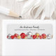 Eine Reihe hübscher Weihnachtsbäume in Silber-, Rot- und Goldtönen stehen am Ende dieses festlichen Holiday-Rücksendelabels. Über dem Bild befinden sich Textfelder, die Ihren Familiennamen im Skript und Ihre Straßenadresse unten enthalten. Einfach zu anpassen!