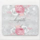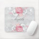 Ein weibliches Mauspad für Ihr Büro. Ein klassisches Imitat silber aussehender Hintergrund. Dekoriert mit Rosa und Weiß Rosen, Blumen und Imitaten silbernen Glitzer, Glitzern. Personalisieren Sie Ihren Namen und fügen Sie ihn hinzu. Der Name wird mit einem modernen handgeschriebenen Stilskript mit Swashes geschrieben. Um die Swashes behalten, löschen Sie nur den Beispielnamen, verlass die Leerzeichen oder Emoji's vor und nach dem Namen.