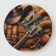 Un tableau représentant deux revolvers brillants et un casquette de cowboy patiné, capturant l'essence de l'ouest sauvage.