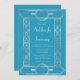 Diese Vintag inspiriert Hochzeitseinladung mit silbergrauem Text auf türkisfarbenem Hintergrund, gerahmt durch eine stilvolle Vintage geometrische Deko-Grenze in Imitaten Silberfolie. Die Rückseite ist türkisblau.