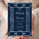 Diese Vintag inspiriert Hochzeitseinladung mit silbergrauem Text auf marineblau Hintergrund gerahmt durch eine stilvolle Vintage geometrische Deko-Grenze in Imitaten silberne Folie. Die Rückseite ist massiv marineblau.