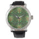 Silver watch with intricate tree design on green face and black leather strap. Back view shows engraved branding and strap details. Elegant and artistic.