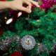 Farbenvolles Weihnachtsgeschmack mit einem Urheber-Kranz auf einem kantigen Set vor einem silberfarbenen Hintergrund. Bild eines weißen Diamant mandala Hintergrund. Benutzerdefinierter Text in schwarz.