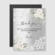 Ein Imitat silber aussehender Hintergrund. Weiße Rosen, Blume und weiße Spitzen. Große handgeschriebene Skripte mit Swashes und den Text: Danke. Personalisieren und hinzufügen Dankeschön Note und Name.