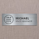 Modernes Arbeitstisch mit Ihrem Firmenlogo vor silbernen Imitaten mit metallischem Hintergrund. Fügen Sie einen Namen und Titel in einfacher Typografie hinzu.
