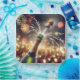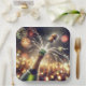 Eine Champagnerflasche bricht mit Sekt aus, wenn der Kork Pop, Set vor einem lebendigen Hintergrund von bunten Feuerwerk