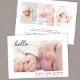 Minimale geschlechtsneutrale Geburtsankündigung mit dem Foto Ihres Babys, überlagert mit "Hallo" in einem einfachen Drehbuch und ihrem Namen, Geburtsdatum und Geburtsdaten in der modernen Typografie. Fügen Sie auf der Rückseite drei zusätzliche Bilder und eine personalisierte Nachricht hinzu.
