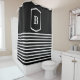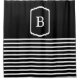 This black shower curtain has an initial that you can change to show the correct monogram. The letter is white and is framed. Horizontal black and white stripes are on the bottom portion. This shower curtain has a classic black and white color scheme.