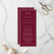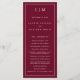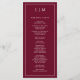 Modernes Hochzeitsprogramm mit einem schlichten und dennoch eleganten Design mit traditioneller Gestaltung. Ihre zwei Buchstaben Monografie ist oben, zusammen mit Ihren Details, umgeben von einem dünnen Rand. Alle Designelemente sind weiß über einen bordeauxfarbenen Hintergrund und können im Entwurfsbearbeitungstool geändert werden. Ein minimalistisches Design mit klassischem Ambiente, das sich ideal für eine feierliche Hochzeit eignet.