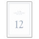 Einfache Hochzeitsfeier mit modernem und dennoch elegantem Design mit zwei Buchstaben Monogramm und Tischnummer, umgeben von einer dünnen Grenze. Alle Designelemente sind staubblau über einem weißen Hintergrund und können in eine beliebige Farbe des Designbearbeitungstools umgewandelt werden. Ein elegantes und stilvolles Design, das sich ideal für ein minimalistisches Paar eignet. Fügen Sie jede Tischnummer einzeln in Ihren Warenkorb.