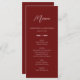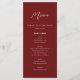 Cette carte de menu mariage de automne moderne et minimaliste propose un agencement simple et propre sur un arrière - plan bordeaux. Le design vous offre de l'espace pour ajouter vos menus de réception de mariage avec les noms de la mariée et du marié et leur date de mariage.