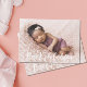 Un simple faire-part de naissance moderne avec nom de bébé en texte blanc sur le devant et message d'information de naissance sur le dos.