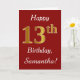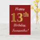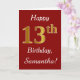 Ce simple design de carte d'anniversaire comporte le message "Joyeux 13ème anniversaire", avec le "13ème" ayant une apparence fausse or. Il comporte également un nom personnalisé et un arrière - plan rouge foncé. Il pourrait être donné à quelqu'un qui célèbre son treizième anniversaire.