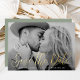 Einfache Save the Date-Karte mit einem vollblutbaren horizontalen Foto mit "Save the Date" in einem Goldfolienskript. Personalisieren Sie die minimalistische Save the Date Karte mit Ihrem Namen, Hochzeitstag und Hochzeitsort. Die Karte kehrt zu einem soliden, grün gesäumten Hintergrund zurück.