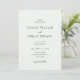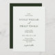 Die Einladung zur Hochzeit ist minimalistisch und elegant mit einem sauberen, grünen Hintergrund und raffinierter Typografie. Es bietet eine Mischung aus großformatigen Serif-Schriftart für die wichtigsten Details und einem zarten kursiven Skript für subtile Betonung. Ohne Verzierungen oder Grafiken schafft das überschaubare und strukturierte Layout ein zeitloses, raffiniertes und schlichtes Aussehen.
