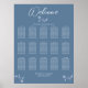 Cette conception comprend un tableau de disposition de bienvenue de mariage floral, s numéro de table de nom de siège d'invité, s calligraphie stylée tendance script, s texte de police de typographie fantaisiste, un panneau d'affiche de réception de mariage, une décoration de réception de mariage moderne tendance, un feuillage de verdure botanique, avec thème de couleur bleu vrai crépuscule, un fond bleu simple texte blanc, pour affiche de tableau de disposition de réception de mariage