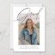 Der einfache Trendy Calligraphy Foto Abschluss Magnetic Invitation verfügt über ein Foto auf der Vorderseite und zwei Fotos auf der Rückseite zusammen mit den Abschluss Einladungsdetails.