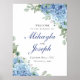 Bienvenue à vos invités dans le style avec cette affiche de bienvenue Blue Hydrangea! Conçu dans un agencement vertical, cet élégant panneau présente des hydrangées d'aquarelle douce dans de belles teintes bleues, ajoutant une charmante touche florale à votre événement mariage ou spécial. Parfait pour accueillir les clients et créer une atmosphère chaleureuse et accueillante.