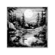 Skandinavische Retrokunst einer Hütte an einem See in einem Bergwald, um Ihrem Zuhause ein nordisches Gefühl zu geben