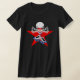 Schädel und gekreuzte Knochen, welche die Spitzee von Rollenderby-Skaten durch die Zähne auf einem roten rollergirl Störsender-Sternhintergrund halten.