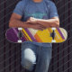 Skateboard in einer lila und goldfarbenen, abstrakten Grafik. Farben Lila, Gold, White Multi Buy, wie es ist oder anpassen Sie dieses Element nach Ihren Wünschen. Bild