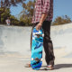 Skateboard wird in einem kunstvoll blauen mehrfarbigen abstrakten Druck gezeigt. Kaufen Sie, wie es ist oder anpassen Sie dieses Objekt nach Ihren Wünschen. Stock Print freepik.com
