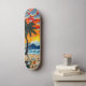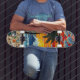 Beach art skateboard. An impasto oil painting style ai illustration of a beach full of palm trees, sea glass, sea shells and ocean waves at sunset. A bright colorful mesh of colors make this coastal art vibrant and beautiful!