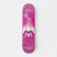 Trio de crânes flamboyants dans les teintes roses avec un arrière - plan à motifs roses. Texte : GIRLY SKATE - GILLS RULE !
