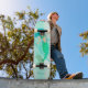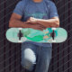 Une sirène avec des cheveux bleus et une queue verte sur un arrière - plan vert. Modifiez le nom de votre propre planche à roulettes ou supprimez-le complètement.
