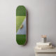 Un Skateboard vert foncé 7 3/4, avec une photo d'un Grasshopper, sur une balustrade.