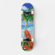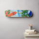 Bonnes fêtes des plages sablonneuses chaudes de votre plage tropicale préférée d'île. Palmier décoré des ornements et des lumières de Noël, avec une rétro planche de surf se penchant contre l'arbre de Noël.